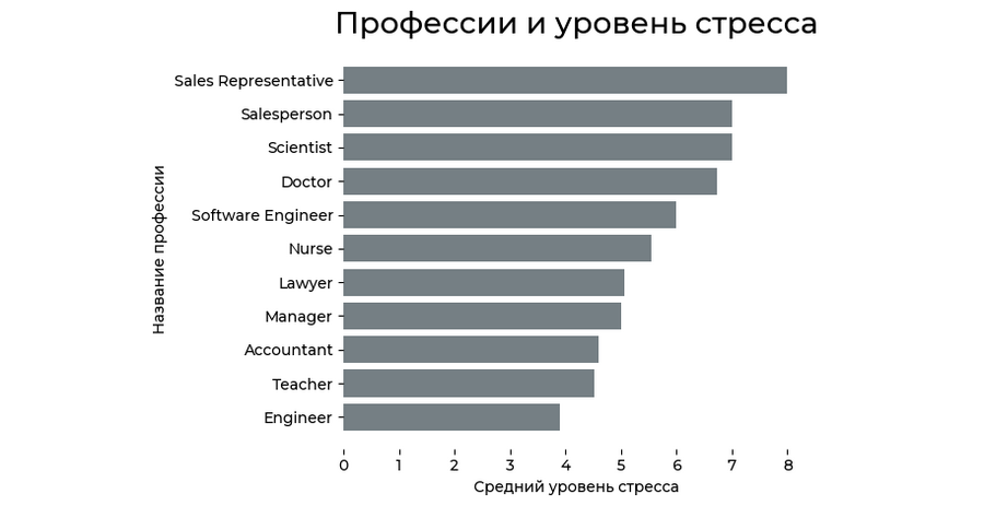 Можно заметить, что сотрудники, работающие в сфере продаж, испытывают более высокий уровень стресса по сравнению, например, с инженерами и учителями — что может показаться немного неожиданным. Следом по уровню стресса идут учёные и врачи.