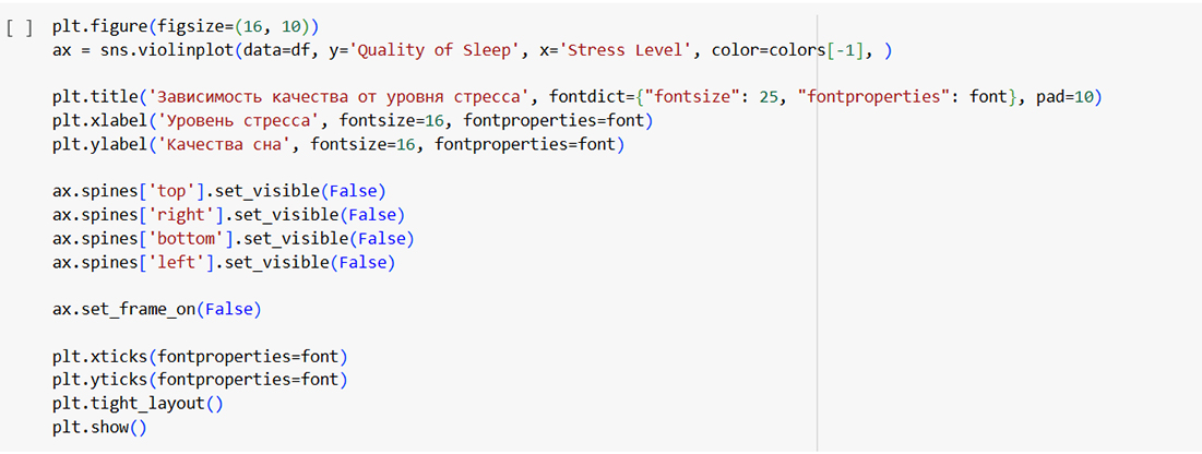 Рассмотрим зависимость качества сна от уровня стресса. Поскольку значения уровня стресса являются дискретными, важно использовать график, отображающий плотность распределения — при обычной визуализации точки могут перекрывать друг друга, и мы не увидим реальной картины. Для этого был выбран скрипичный график.