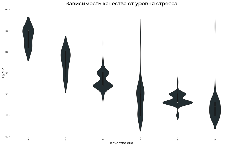 Рассмотрим ещё один важный показатель — пульс. Попробуем выявить зависимость между частотой пульса и качеством сна. В целом заметно, что при высоком пульсе качество сна, как правило, ниже. Однако на графике наблюдается выброс: при оценке сна 9 график сильно вытянут вверх, что может указывать на то, что даже при высоком пульсе возможен хороший сон. Это, впрочем, может быть связано с ошибкой измерительного устройства или недостоверной самооценкой участника.