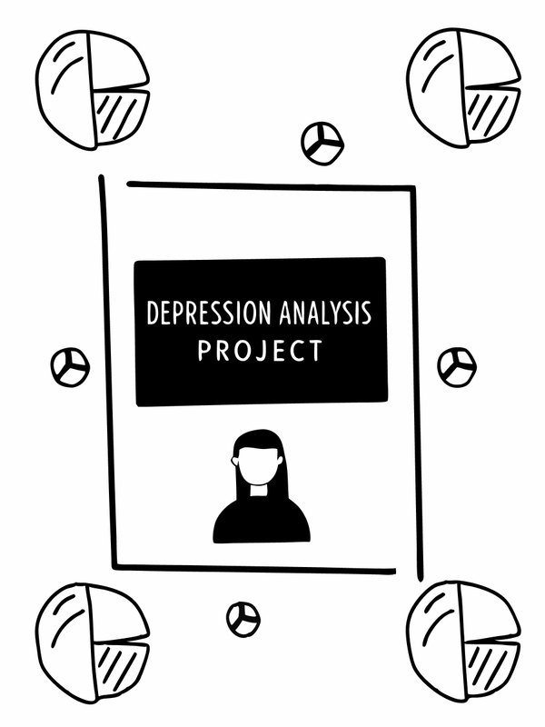 Обложка создана в Recraft.ai: A minimalist cover design for a depression analysis project. Central elements include a clean silhouette of a student and a simple brain icon, surrounded by subtle data visualization elements like small bar charts or pie segments. The title 'Depression Analysis Project' is displayed prominently in the center