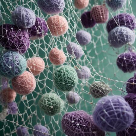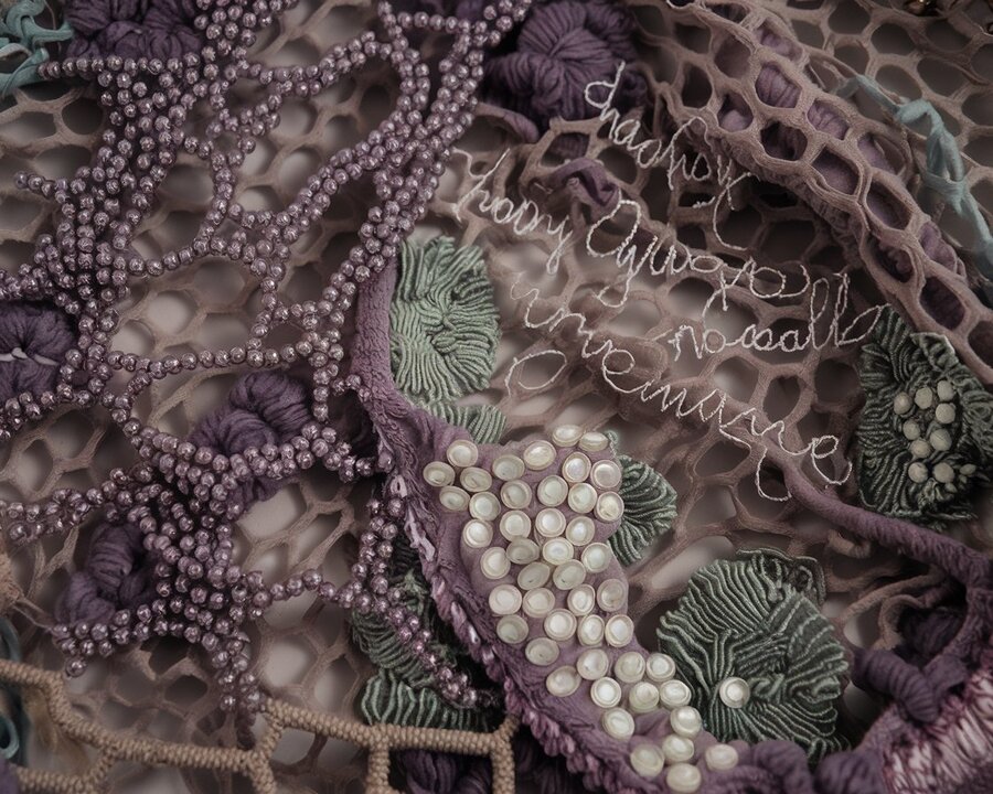 fishing nets made of fine soft fluffy yarn with large cells, in which some places are decorated with shiny beads and embroidered with buttons so that visually it resembles algae and corals of muted dark lilac pale emerald and mother-of-pearl colors. There are ragged holes inside the network, the side threads from them are collected into handwritten phrases