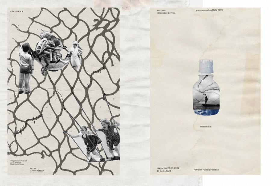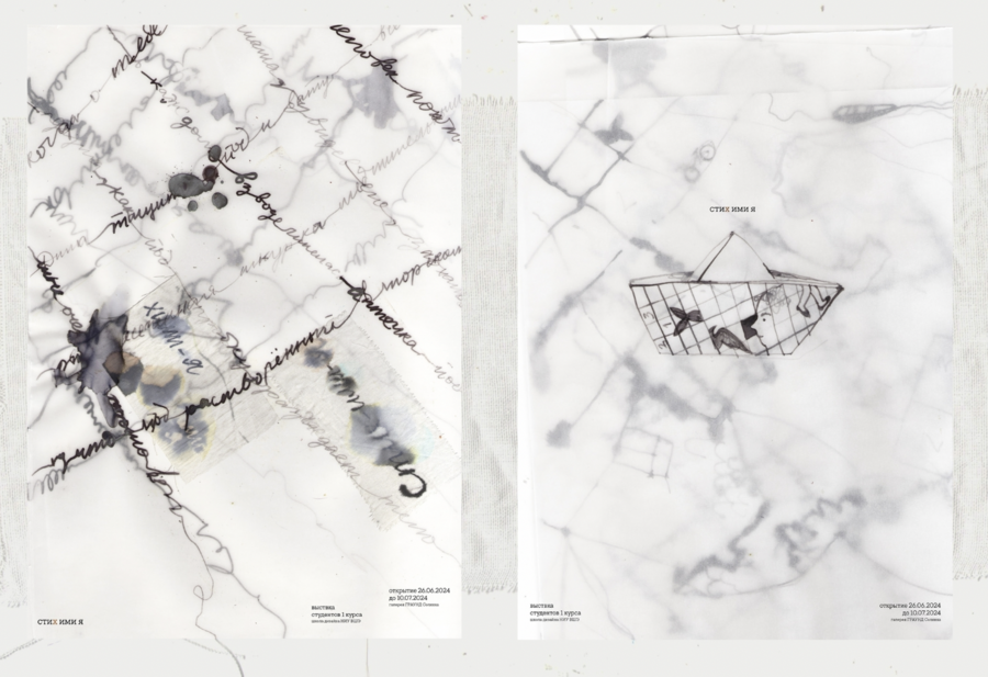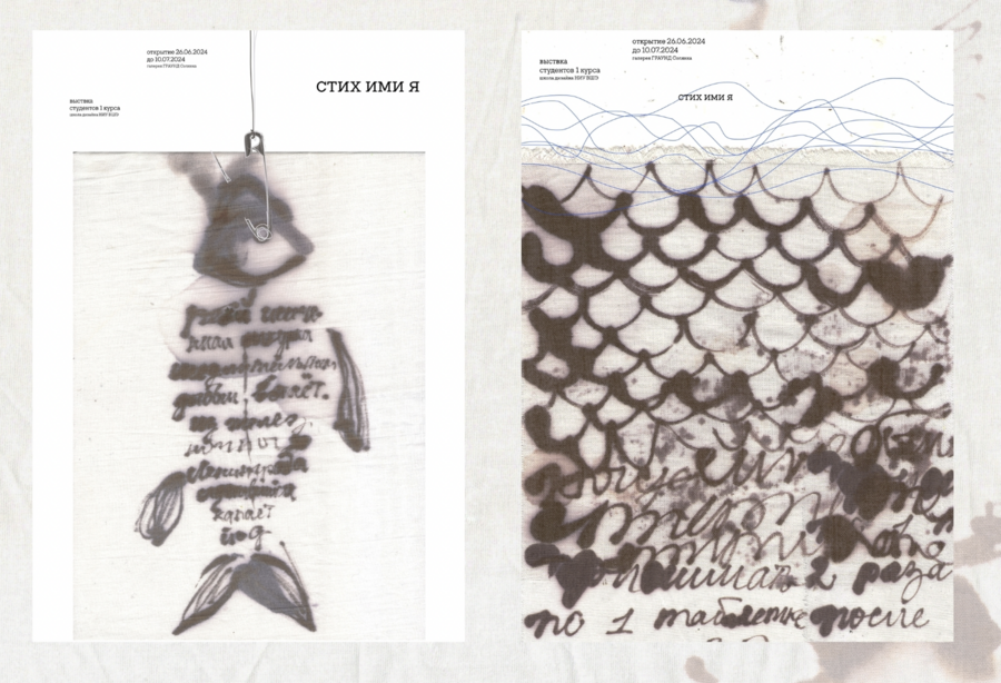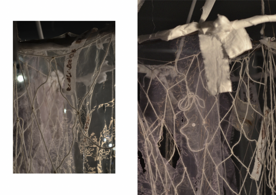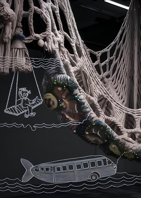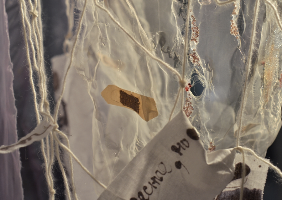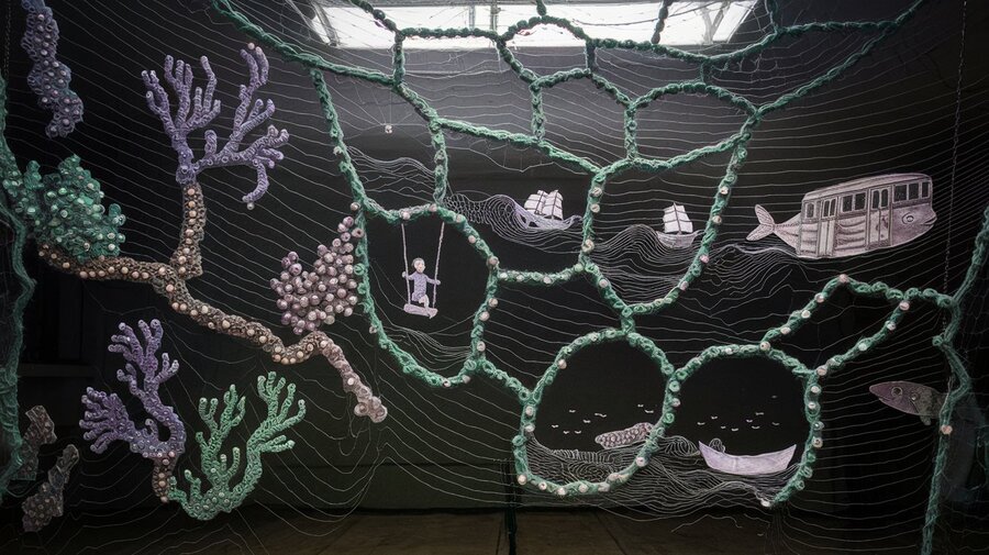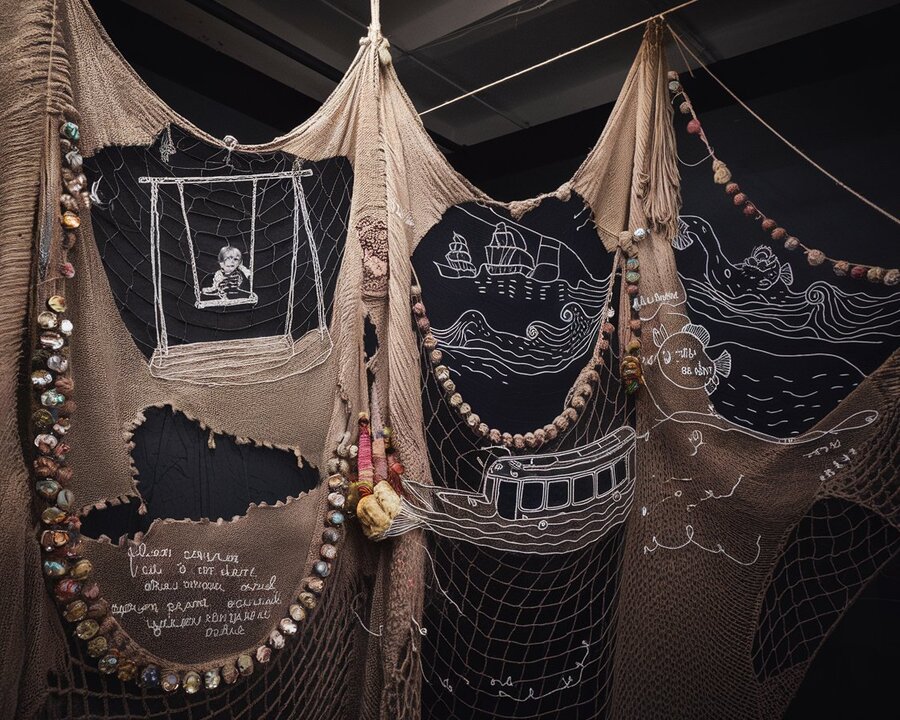 Art object: four large thin long natural tree branches hang from the ceiling in a chaotic manner, they are casually wrapped with bandages and a small amount of cotton wool, large fishing nets tied from thin soft light yarn hang from the branches to the floor, but some cells are decorated with beads and embroidered with buttons, so that visually it resembles stuck and algae and corals hanging on them are dark lilac, muted emerald and mother-of-pearl shades. These networks are connected to each other in such a way that handwritten phrases and images are embroidered with a single white line from the extensions of the side lines of the grid. These images are 1) swings and children’s legs riding on them with patches on their knees, 2) old ships with nets float on the waves, and in places the waves turn into handwritten words, 3) fish with hand-embroidered words instead of scales, 4) an old Soviet subway car with a fish tail 5) an old boat. Also, in places the thread breaks off, and in places this connection is a phrase embroidered in handwritten handwriting. The art object is located in a dark room of the gallery and is slightly illuminated from above.