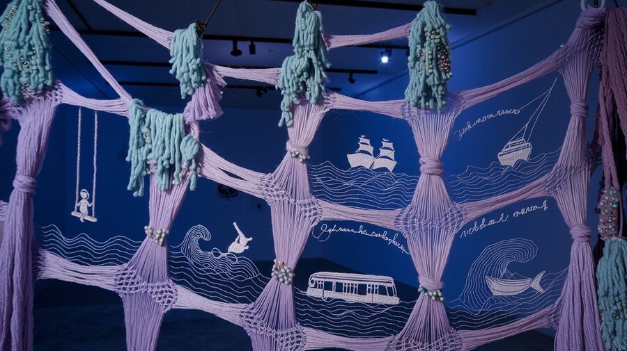 fishing nets made of fine soft fluffy yarn with large cells, in which some places are decorated with shiny beads and embroidered with buttons so that visually it resembles algae and corals of muted dark lilac pale emerald and mother-of-pearl colors. There are torn holes in the networks, in places of holes the side threads continue and gather into pictures and form their contour with one white line. These pictures: 1) a swing and a child riding on it with patches on his knees, 2) the lines continue and turn into waves, along which old ships with nets sail and the waves turn into handwritten words in places, 3) a fish with handwritten words embroidered instead of scales, 4) an old Soviet subway car with a fish tail 5) an old boat on the waves. Also, in places the thread breaks off, and in places this connection is an embroidered phrase in handwriting. A network of muted milky and lilac flowers and is located in a dark room and slightly illuminated from above.