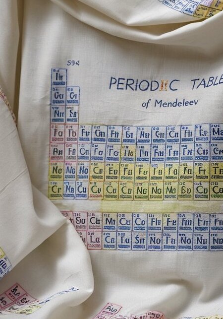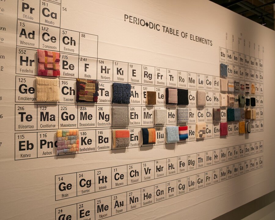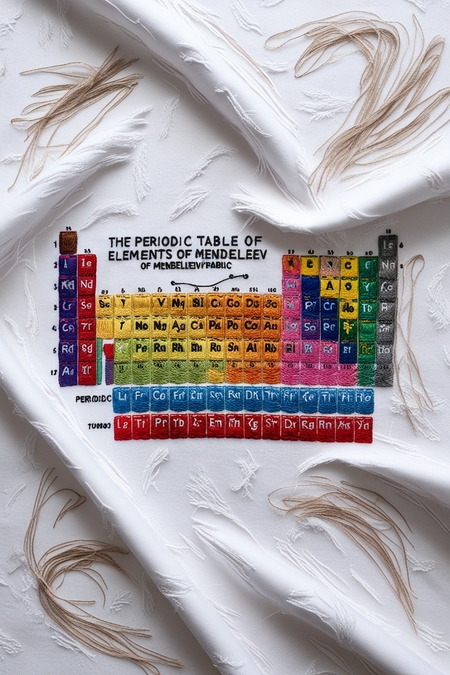 a poster at the exhibition. The periodic table of Mendeleev’s elements is drawn on the poster with a thin black line, but several cells are filled with squares made of textiles. These textile cells are evenly spaced throughout the table. Cells of different colors and materials. In the remaining cells, the names of the elements are indicated on a white background.