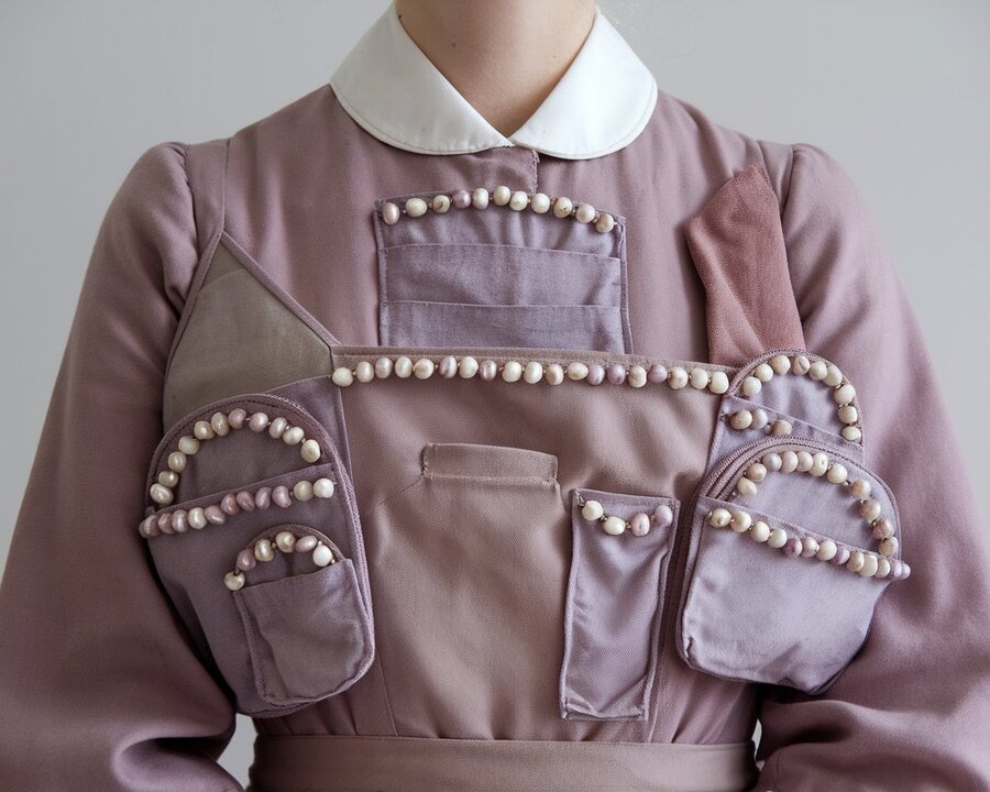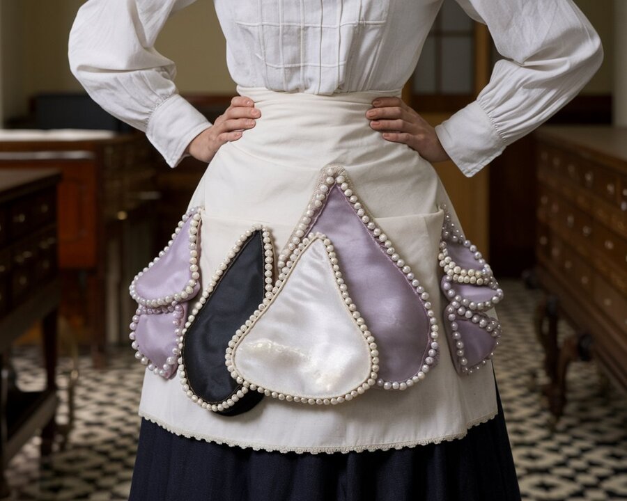 a full-length model in a 19th-century nurse’s cap suit and a 19th-century nurse’s apron with a number of chaotic pockets: one pocket like a fishtail, several semicircular ones also of different rectangular shapes on the front. The pockets are slightly and chaotically decorated with mother-of-pearl beads and lilac muted color beads