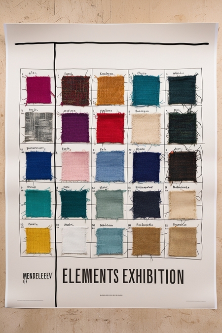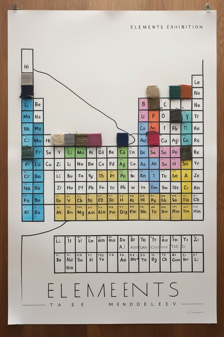 a3 vertical poster. On the poster, a thin black line draws a small part of the periodic table of elements of Mendeleev, but several cells are filled with squares made of textiles. These textile cells are evenly spaced throughout the table. Cells of different colors and materials. In the remaining cells, the names of the elements are indicated on a white background. The poster also says «Elements Exhibition»
