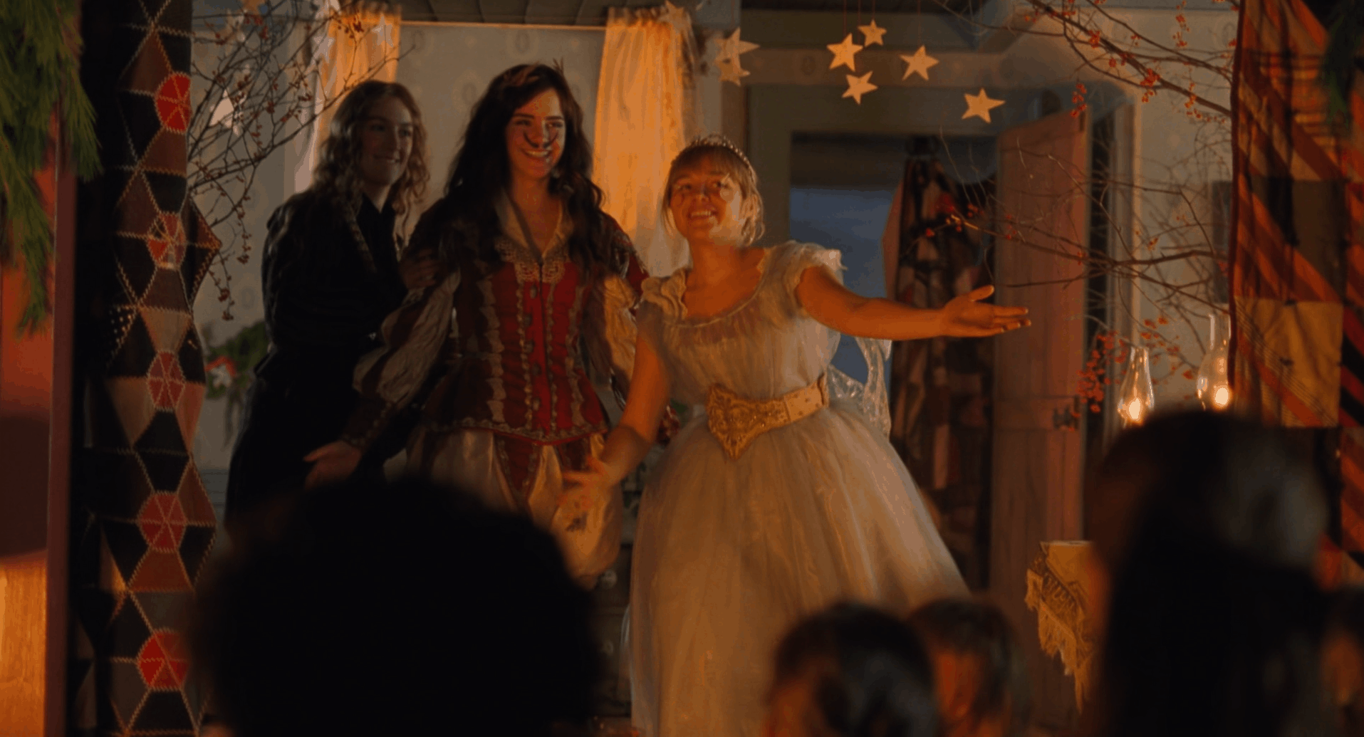 Дом семьи Лоренс отличается своим размером, но в кадрах, где зритель видит дома соседей через окно, не создается впечатление кардинального различия, несмотря на богатство Лоренсов. Кадры идентичны по плану и ритму, это показывает сходство двух семей. В свою очередь, сцены рождественских ужинов дают нам понять, что в семьях царит противоложный уклад. В семье Марч нет места субординации и серьезности, в ней живут уют и наполненность, в отличие от Лоренсов.