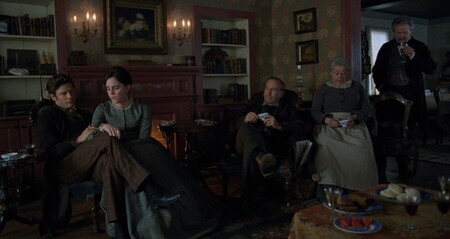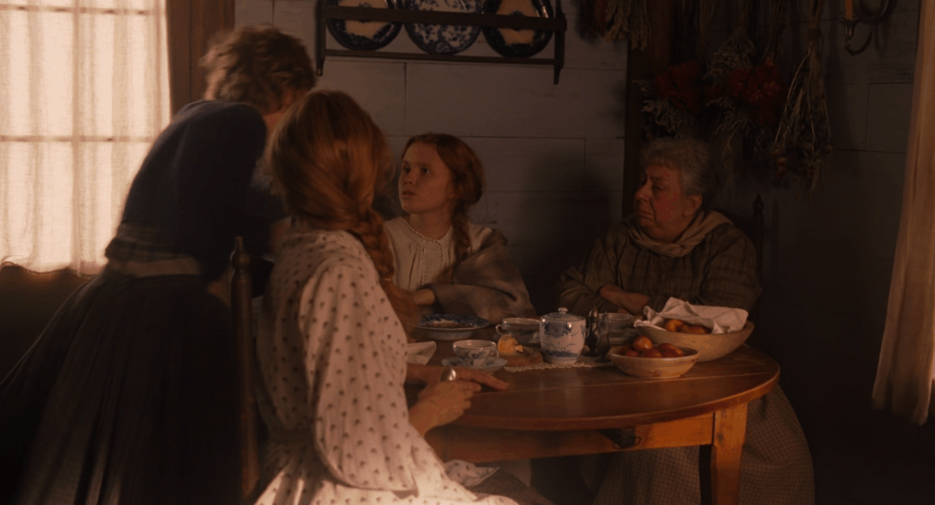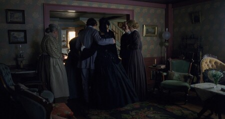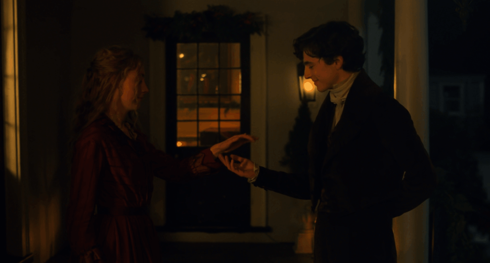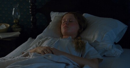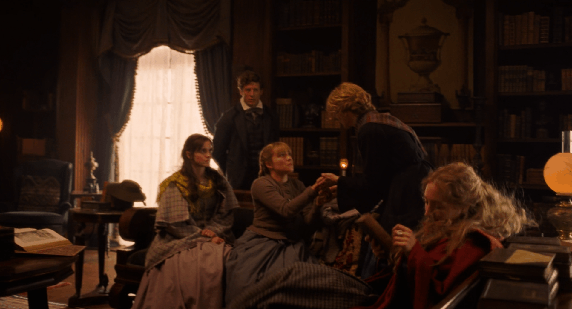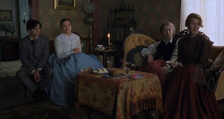 Бет Марч умирает дважды, но оба раза Грета Гервиг делает это визуально разными смертями. Первая болезнь показана как тёплая, почти рождественская драма: свет камина, насыщенные цвета, сестры рядом. Вторая болезнь — холодная, тихая, почти монохромная, неизбежно ведущая к катастрофе.