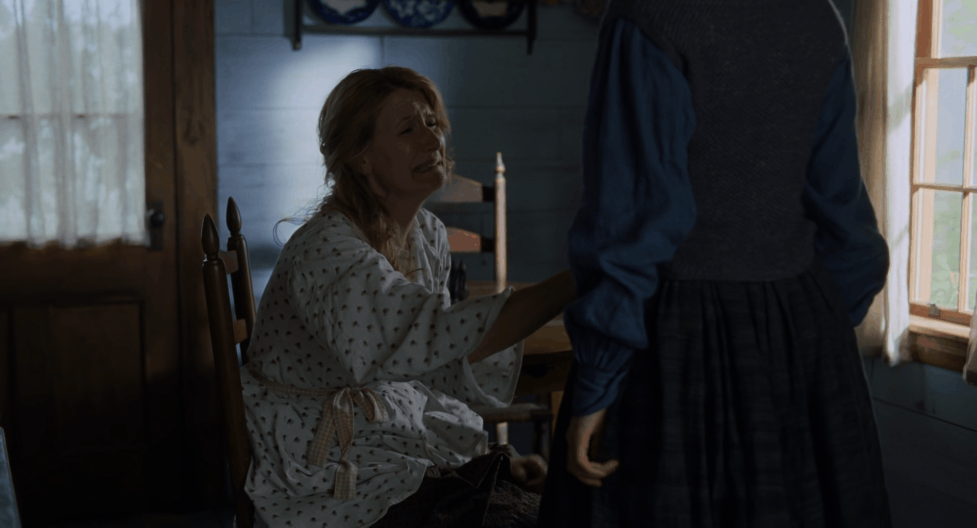 В настоящем зрителю показывают окружение больной. Вертикальные линии элементов окна и кровати дробят кадр, делая его менее интимным и более строгим, взрослым и печальным. Сестры, находясь рядом, все же визуально отделены от Бет, так очерчивается грань между умирающей и живыми.