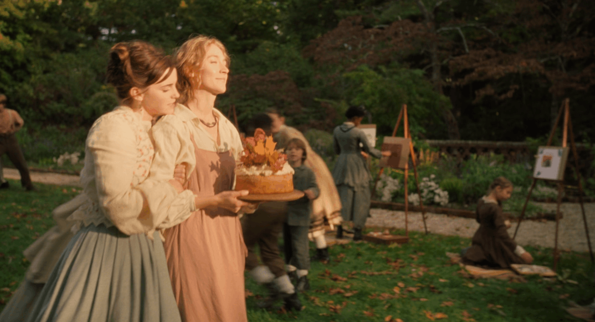 Знакомство с сестрами Марч начинается в настоящем. Зрителям показывают каждую из сестер, а затем более детально то, чему принадлежит ее жизнь: писательству, материнству, музыке или живописи. Также в этих кадрах мы видим сходство сестер в настоящем — почти все они зажаты в рамках реальности.
