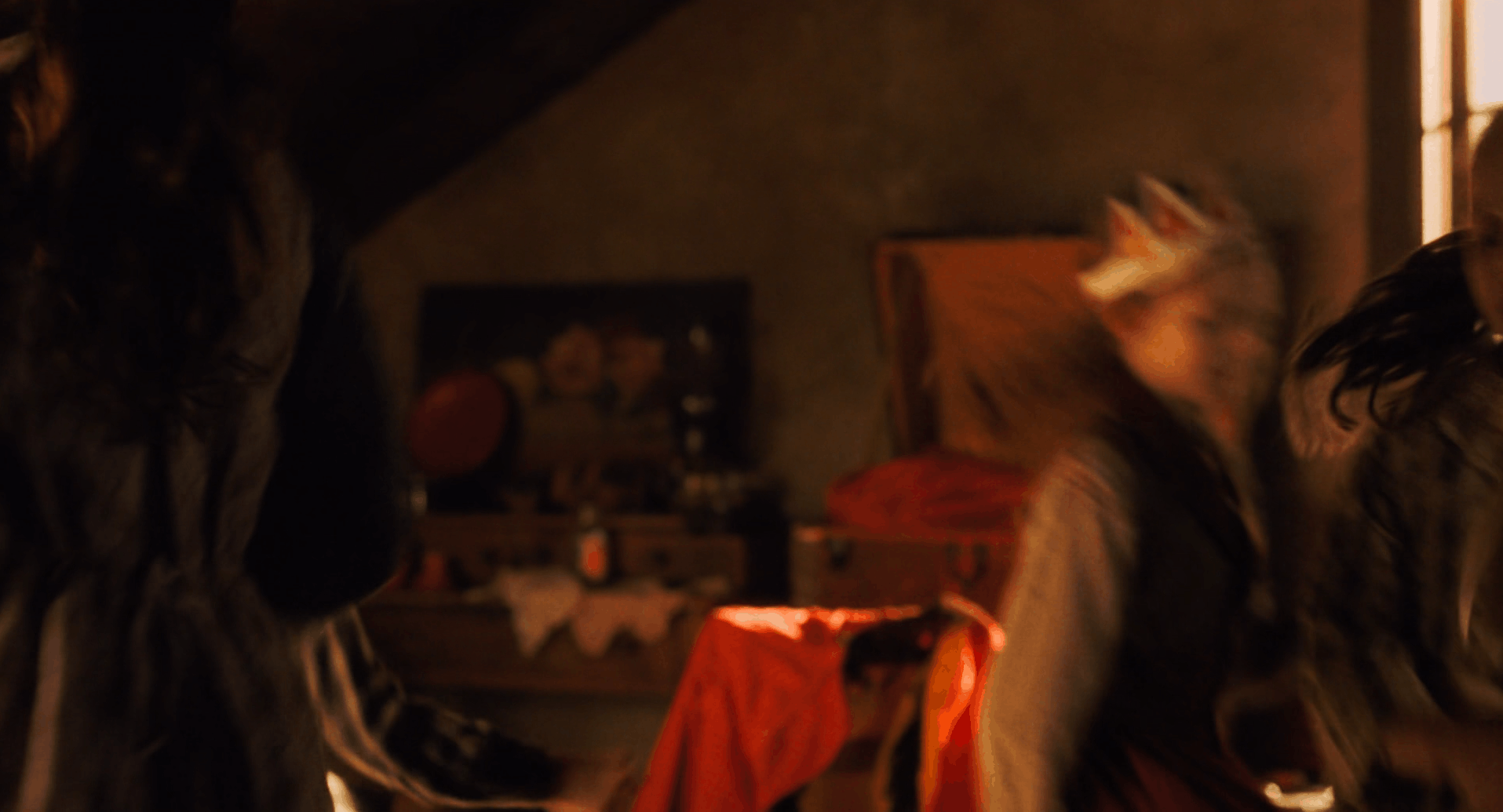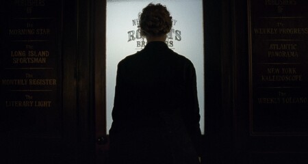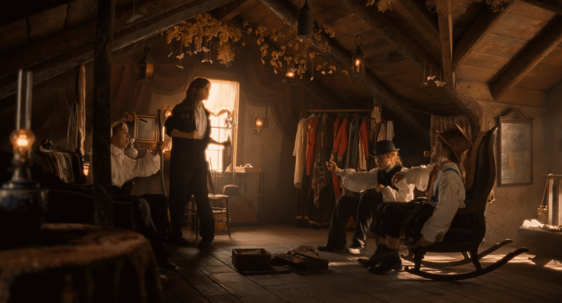 Джо, которая пишет рассказы ради денег в своей маленькой комнатке в Нью-Йорке стеснена обстоятельствами: кадры максимально тесные, зритель видит только героиню в тусклом свете и ее напряженный труд. После пережитой утраты Джо села писать, чтобы создать то, о чем она мечтала в детстве. Она пишет свой роман там же, где писала сценки и играла в них со своими сестрами. В этих кадрах больше света, он не отличается теплом, но мы лучше видим Джо и масштаб того, что она создает. Когда роман готов — это уже не просто стопка листов в ее руках, он занимает все пространство, вытесняя своим объемом ее в угол такой знакомой комнаты.