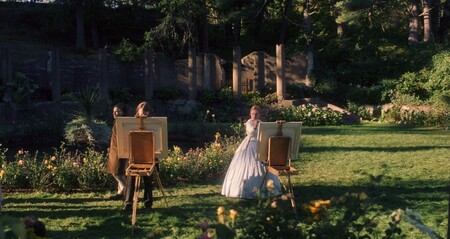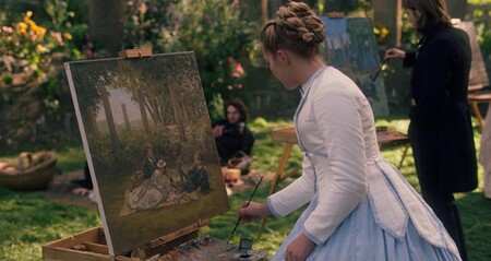 Эми Марч — художница, она обучается в Европе и наслаждается жизнью в светском обществе. В отличие от сестер, она не стеснена в финансах или здоровье. Поэтому зритель не видит явных визуальных ограничений. К сожалению, она недостаточно талантлива, по собственным меркам, поэтому ее сразу же показывают в сравнении с другим художником. Но также как сестры, она одинока, девушка в светлом противопоставлена молодым людям в темном.