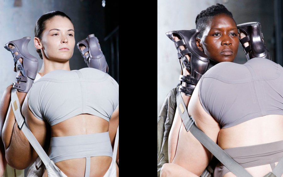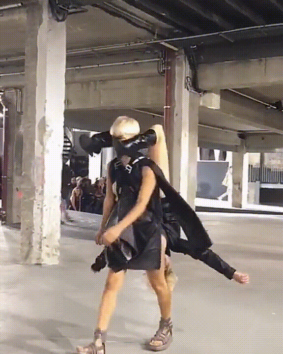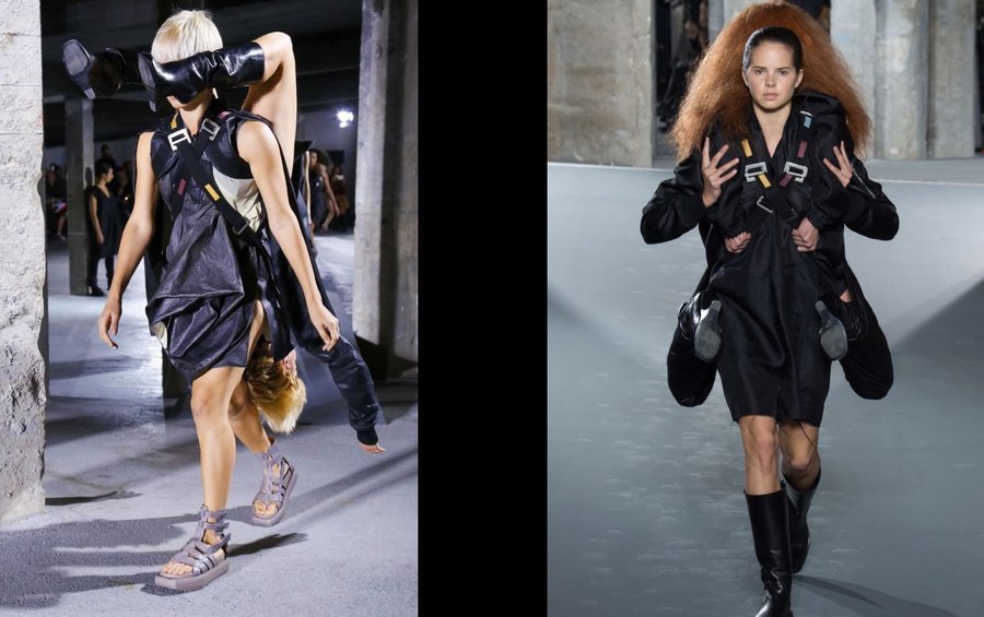 Данный фрагмент показа Rick Owens, в котором модели буквально привязаны друг к другу, дизайнер использует как форму социального перформанса, чтобы поставить под вопрос традиционное понимание «сильной женщины» и показать, что женская сила — не исключение, а естественное состояние, что созвучно идее Ницше о разрушении условностей и переосмыслении норм.