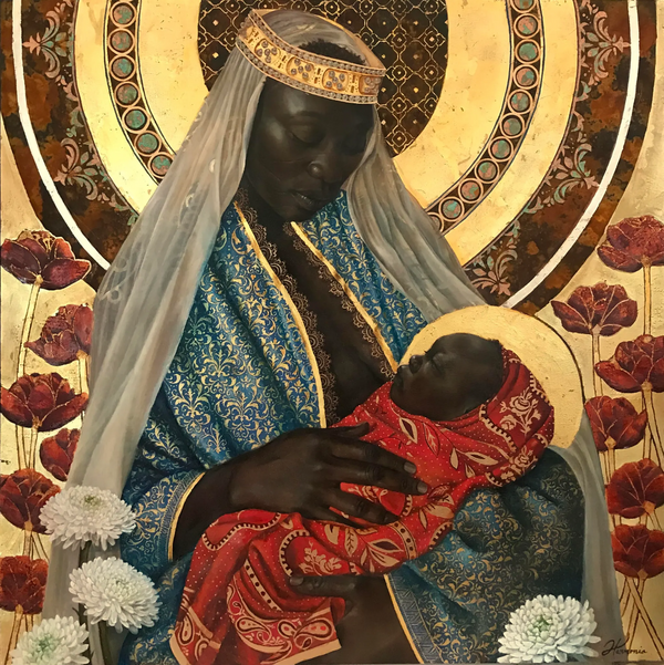 Слева направо: «Мадонна с младенцем», работа неизвестного нидерландского живописца, XVI // «Богоматерь Регла», Гармония Розалес, 2021