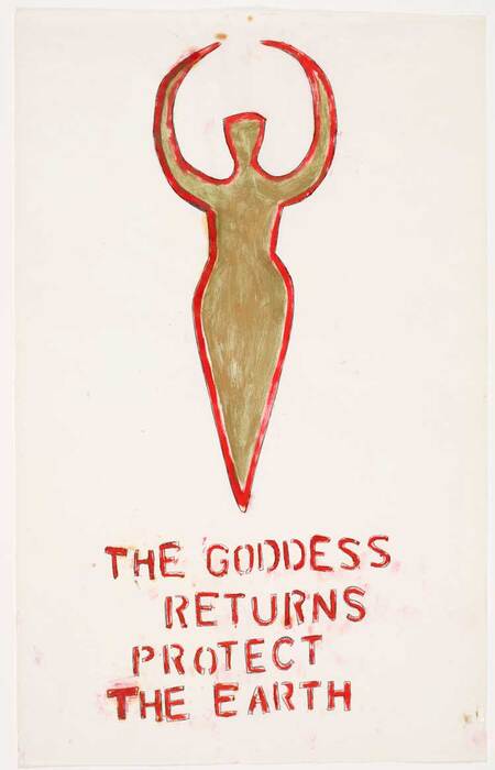 Примером могут послужить художественные работы Моники Сьё на выставке «Великая космическая мать». Художница глубоко исследует темы экологии, материнства, зависимого положения женщин и физического и эмоционального насилия, с которым они сталкиваются.