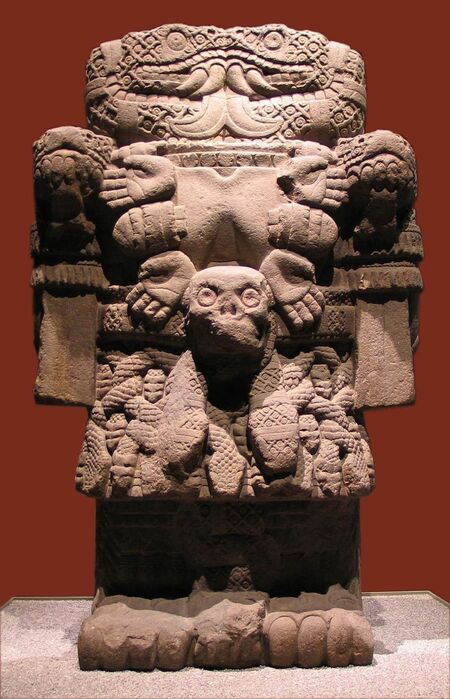 Моника Сьё, «Великая космическая мать», 2023 // Статуя Коатликуэ. 15 в.