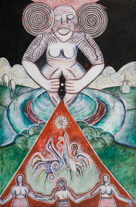 Слева направо: Моника Сьё, «Богиня возвращается, чтобы защитить Землю», 1998/1999 // Женские статуэтки из Триполья, ок. 4000 до н. э.