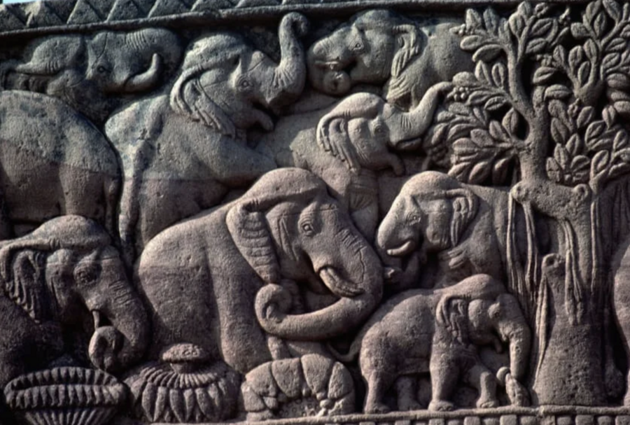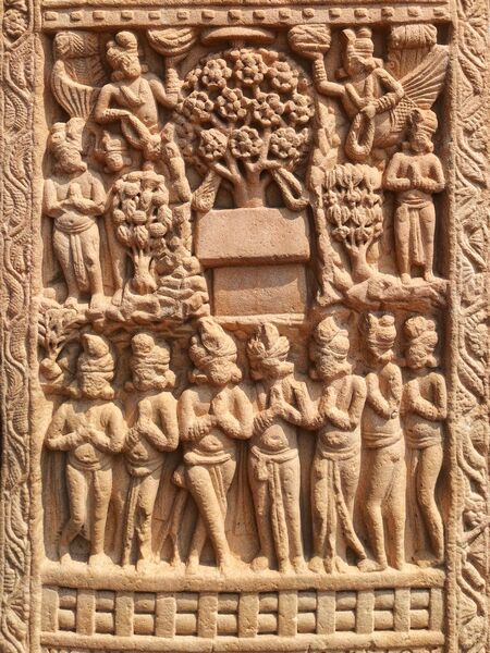 На северных воротах в верхней полосе скульптур представлена сцена поклонения слонов священному дереву. С двух сторон медленно приближаются к священному дереву тяжелые фигуры слонов. Их хоботы как бы качаются, скручиваются и протягиваются к дереву, создавая плавное ритмическое движение. Обилие изобрежений богатства природы: пышные и крупные цветы, ползучие растения, богатство фауны — всё это включают в себя рельефы Ступы в Санчи.