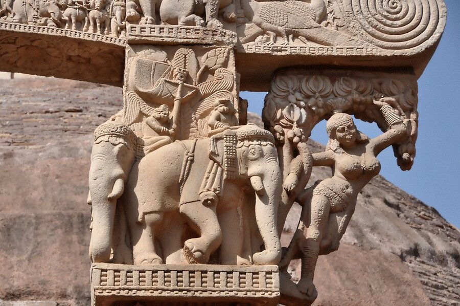 Рельефы, украшающие ворота, обращены к джатакам — легендам из жизни Будды, перерабатывавшим мифы Древней Индии.