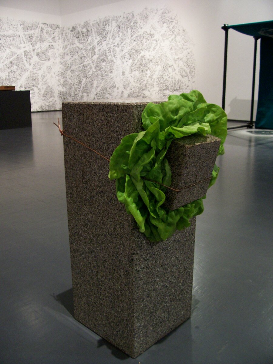 Салат увядает, камень остаётся. Материал живёт своим темпом, меняя работу прямо на глазах. Ансельмо интересовался взаимодействием живого и неживого. Работа буквально живёт и умирает, и это часть её смысла.