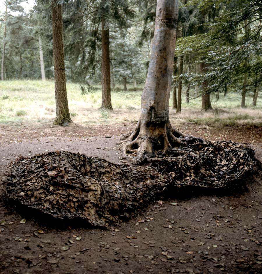 Эта работа построена на естественном взаимодействии дерева с окружающей средой. Пеноне собирает листья, кору, ветки и переплетает их вокруг корневой системы таким образом, что материал начинает выглядеть как некое продолжение дерева. Листья–это след сезона, температуры, ветра, влажности.