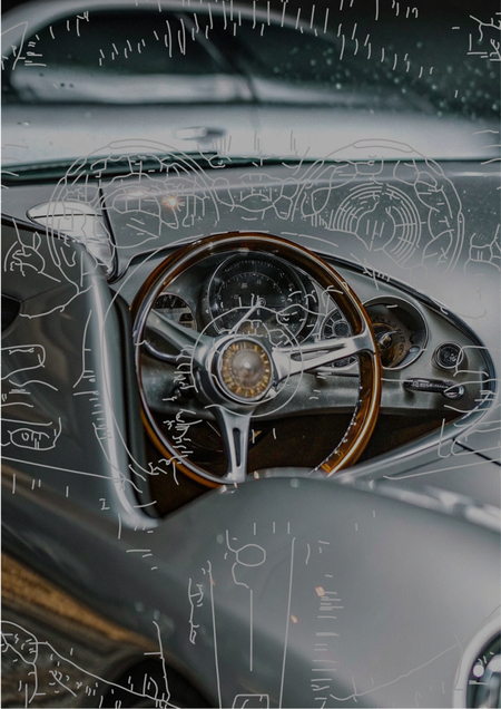 Графические элементы построены методом трассировки, при котором контуры и детали фотографии автомобиля обведены линиями, превращая реальные формы в схематичный графический рисунок
