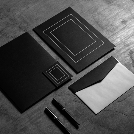 1/Minimalist stationery and branding set, black and white geometric style, black square with inner rectangle and simple abstract statuette motif, negative space and clean lines, includes business cards, letterheads, envelopes, pen, flyer, cohesive and modern design, elegant and memorable