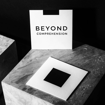 2/ Minimalist black and white exhibition card design for «BEYOND COMPREHENSION». A clean geometric layout featuring the logo: a black square with a white rectangle (pedestal) and a small abstract black fragment on top. The card has large white space, simple sans-serif typography (Helvetica Neue or similar), precise alignment, and strong composition.