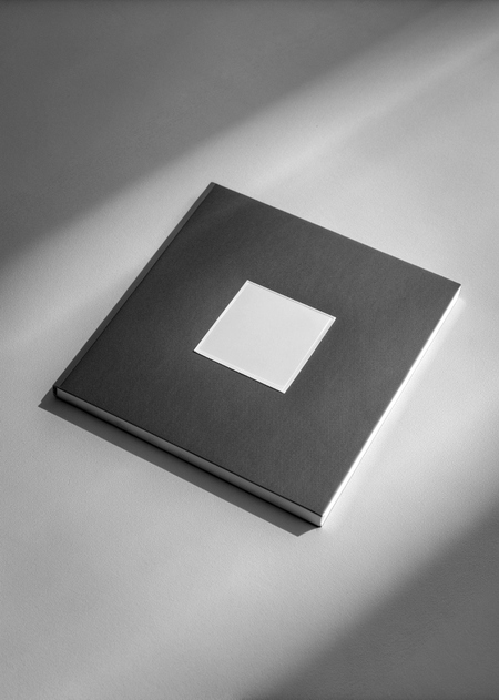 1/ Minimalist square-format art book with a matte black cover, centered white square on the cover, placed on a clean white background, soft diffused lighting, subtle shadows, modern and refined aesthetic, photorealistic, cinematic composition, no text, no logos, vertical shot from the top, no other objects