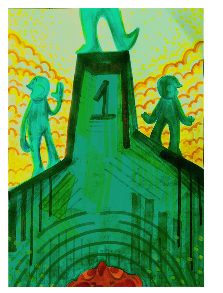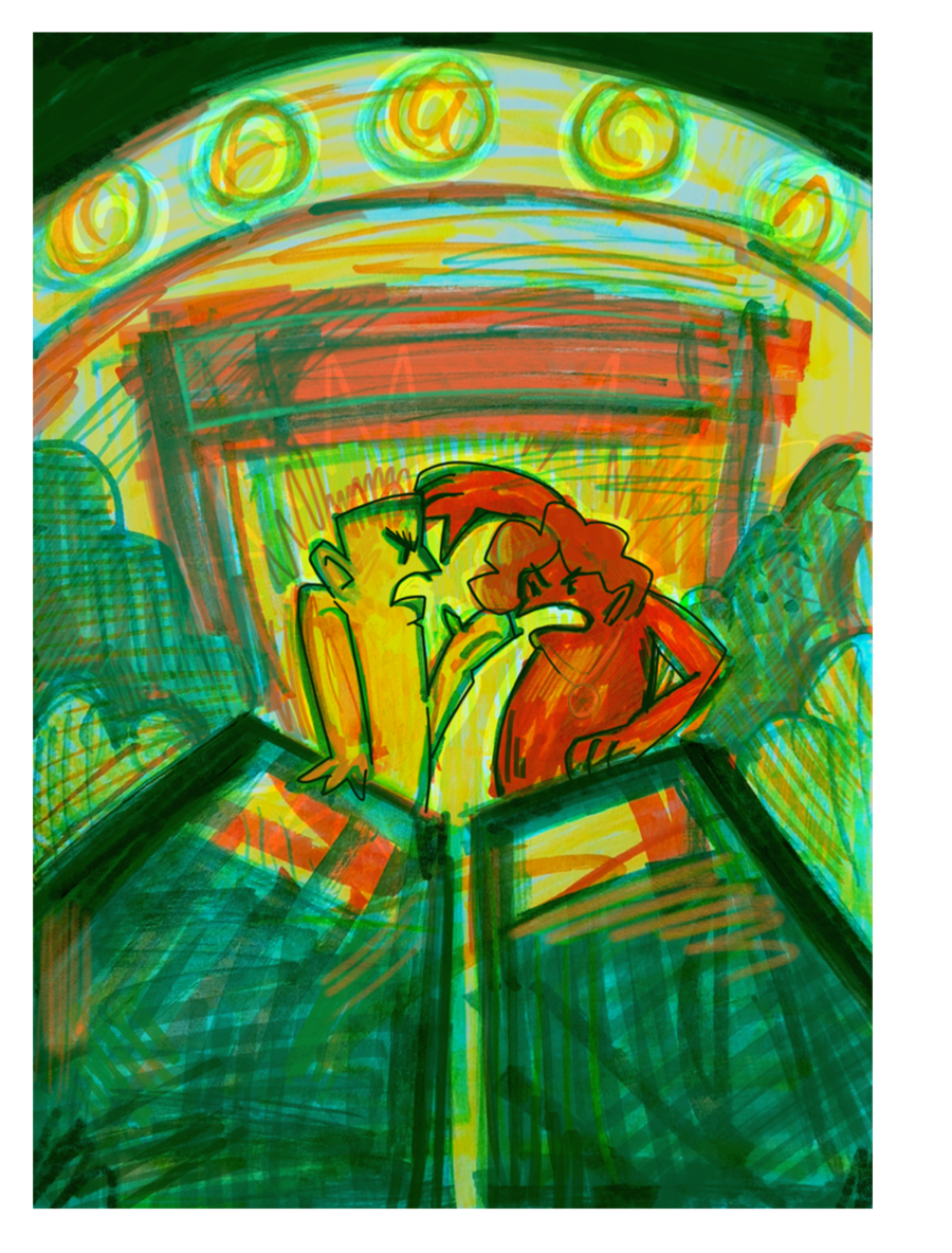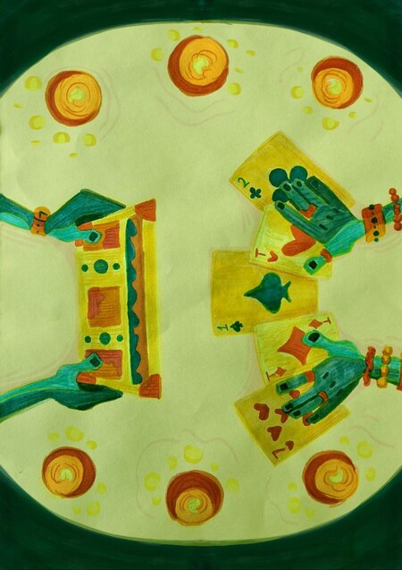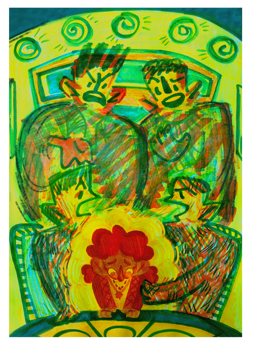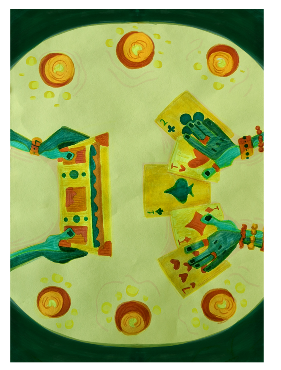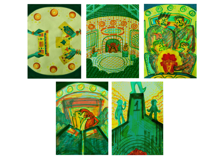Серия иллюстраций «Пятерка мечей» рассказывает историю амбициозной гадалки, уверенной в своих экстрасенсорных способностях, которая решает принять участие в популярном интеллектуальном шоу. Сможет ли она победить или ее сил окажется недостаточно? Работа выполнена маркерами с доработкой цветными карандашами