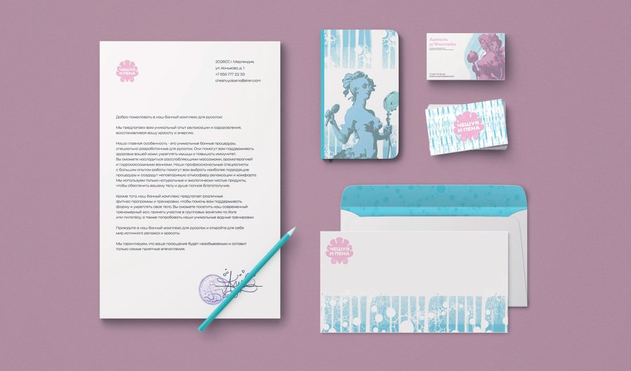 Промт для логотипа: A mockup of printed materials on a white background for the Mermaid Bath Complex. There’s a pink paper with the text «Welcome to the Mermaid Bath Complex» in blue. There’s an envelope with the same text. And there are business cards with the name «Mermaid Bath Complex» and a phone number. The pink paper and the envelope have a light blue border. The business card has a mermaid tail and a bubble. ideogram.ai