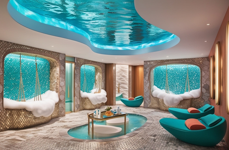 Промт для пенного комплекса: generate a zone of the bath complex: Design and atmosphere Interior Theme: An underwater kingdom combining natural elements and elegance. Materials: Mosaic tiles with a scaly pattern, natural stone, glass with iridescence. Lighting: Soft light with a wave effect on the ceiling and walls, creating a feeling of being underwater. The color palette The main colors are turquoise, coral, mother of pearl. Accents: silver and gold. Foam Bay A room with thick, fragrant clouds of foam. Themed flavors: coconut, sea salt, seaweed, tropical fruits. Relaxation hammocks suspended in the «cloud». Leonardo Phoenix 0.9, 3D Render