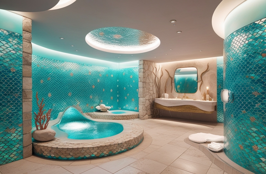 Промт для бассейна: generate a zone of the bath complex: Design and atmosphere Interior Theme: An underwater kingdom combining natural elements and elegance. Materials: Mosaic tiles with a scaly pattern, natural stone, glass with iridescence. Lighting: Soft light with a wave effect on the ceiling and walls, creating a feeling of being underwater. The color palette The main colors are turquoise, coral, mother of pearl. Accents: silver and gold. Sound atmosphere Scaly Mermaid Pool: A small pool with a mirrored bottom that creates the illusion of swimming in scales. Built-in hydro massage areas. Leonardo Phoenix 0.9, 3D Render