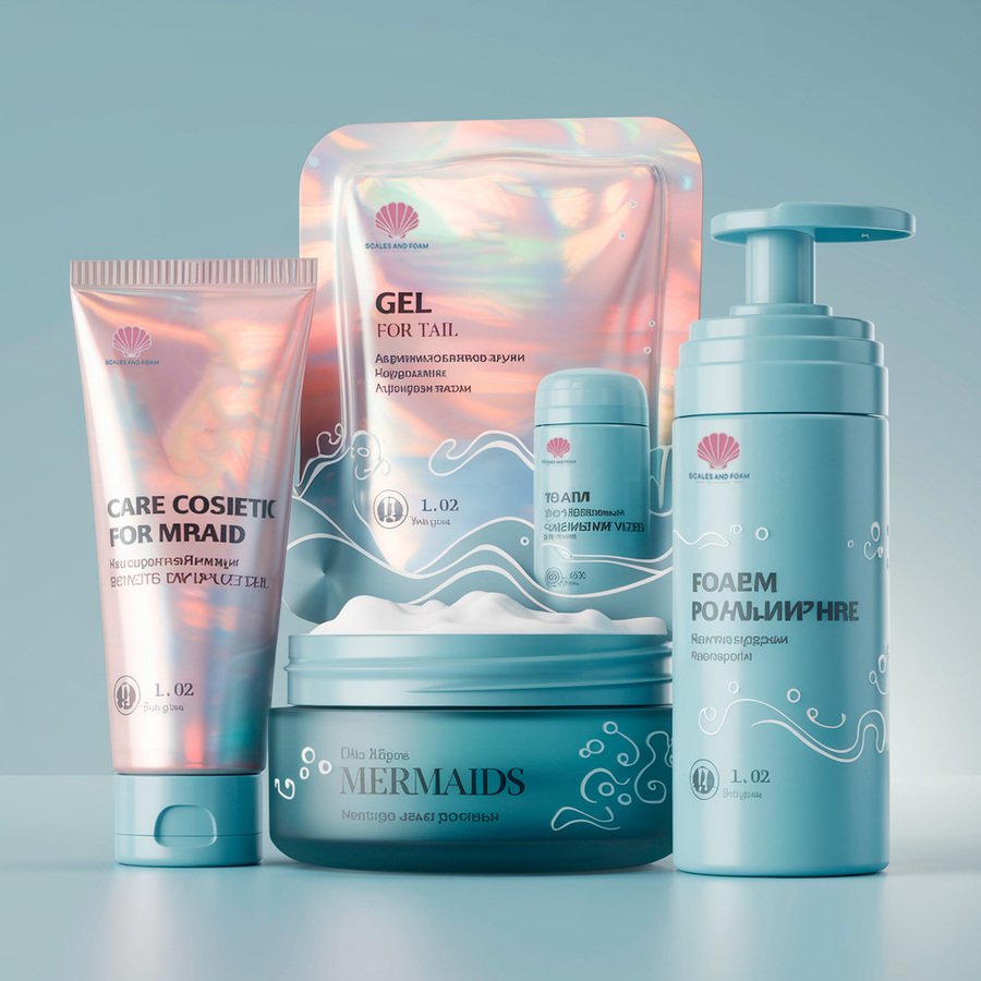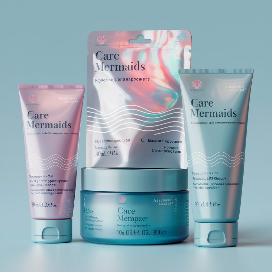 Промт для первой коллекции: A 3D render of a package of care cosmetics for mermaids. The package contains a gel for the tail, a scrub for the tail, and a foam for washing. The colors of the products are mother-of-pearl pink and delicate azure. The package has a minimalistic design and features light waves. ideogram.ai