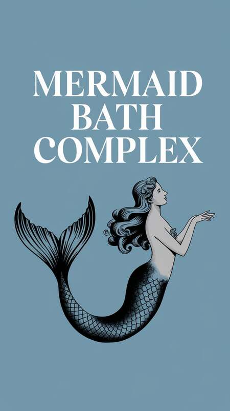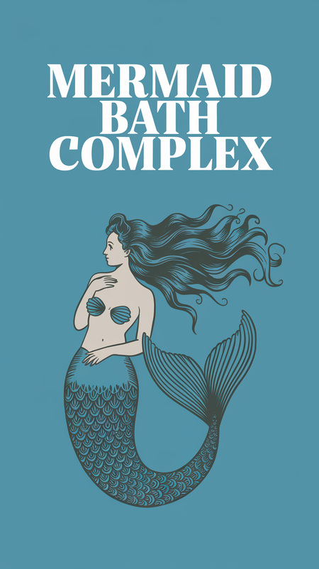 Промт для плакатов: A minimalistic poster for the Mermaid Bath Complex. There’s a small illustration of an antique mermaid with long, flowing hair. She has a tail with intricate scales. The background is light blue. There’s text that says «Mermaid Bath Complex» in bold, white letters. ideogram.ai