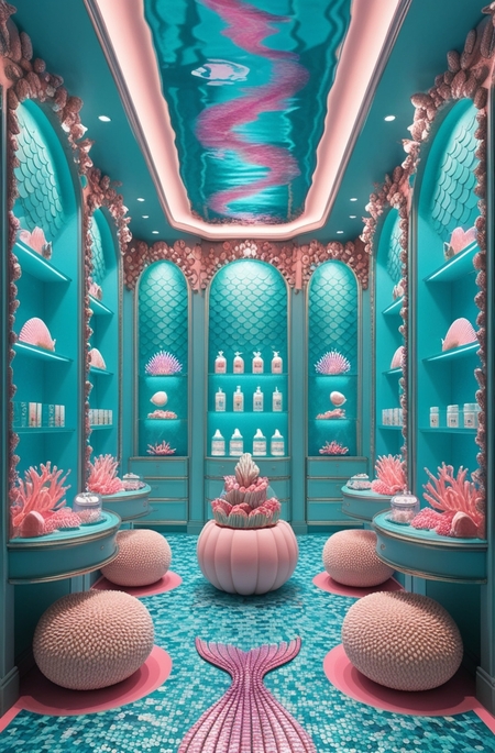 Промт: high quality, 8K Ultra HD, 3D effect, generate a shop for mermaids. Scales and Foam is a unique space where sea magic meets beauty care and relaxation. The store offers specialized products for mermaids and those who want to feel closer to the underwater world. Interior Design: The store is decorated in the style of an underwater palace with elements of a marine theme. The walls shimmer like scales, the floor is decorated with mosaics resembling the bottom of the ocean. Lighting: Delicate turquoise and pink light accents create the effect of shimmering water. Zones: Coral display cases: Products are displayed in coral-shaped display cases. «Shell islands»: Open areas with soft poufs in the form of pearls for product testing. Leonardo Phoenix 0.9, 3D Render
