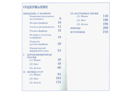 Для детального рассмотрения я отобрала статуэтки трёх временных периодов: дореволюционной России, СССР и современности; согласно этому разделению сформированы три основные главы исследования. Каждая часть разделена на три подглавы, рассматривающие ключевые составляющие фарфоровой статуэтки: форму, цвет и детали.