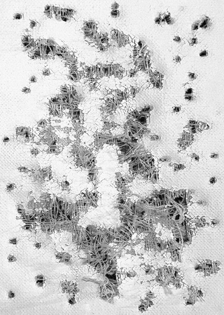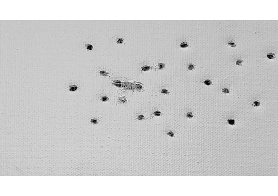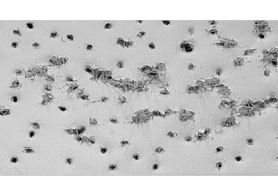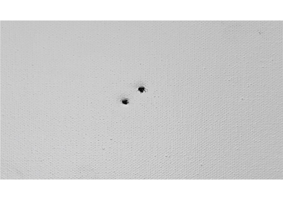 Видеоработа «1, 2, 3, 4…» представляет собой визуализацию безостановочности бесконечной череды утрат. Отверстия появляющиеся на холсте говорят нам о многочисленных людских смертях. Со временем их количесвто настолько увеличивается, что посчитать становится просто невозможным.