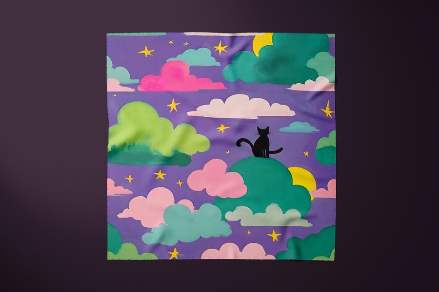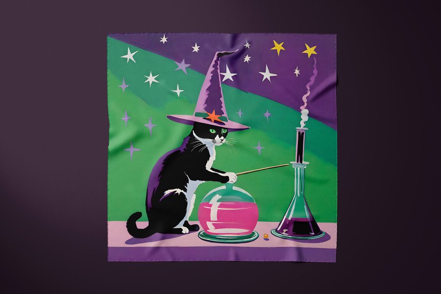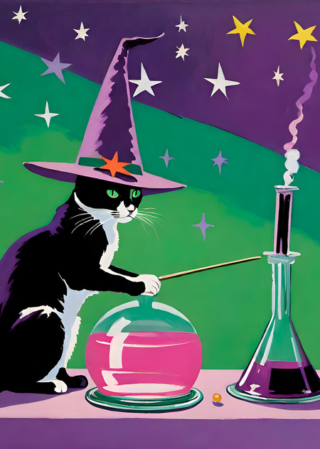 Прикрепить карточку Промпт: print with cat in witch hat, cat makes experiments, stars around, purple-pink and green colours.