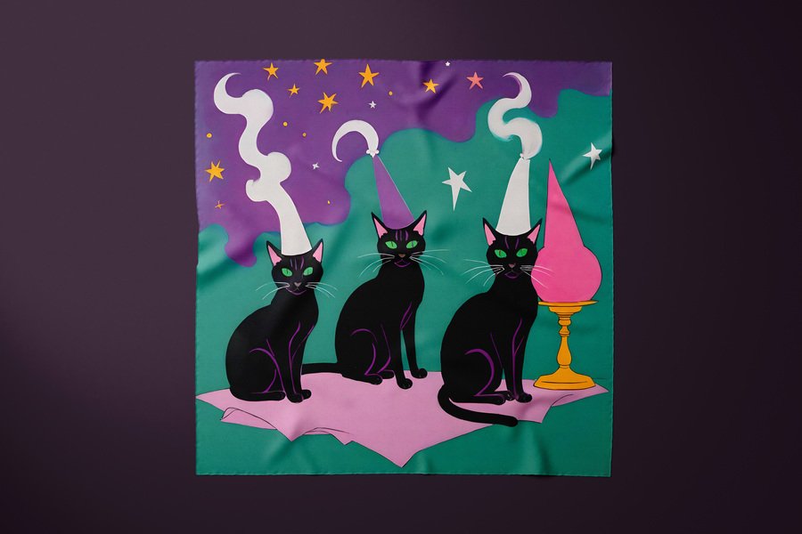 Прикрепить карточку Промпт: print with witch-cats, coloured smoke comes out of their hats, stars around, purple-pink and green colours.