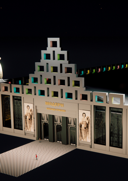 Проект представляет собой фасад манежа, выполненный в стиле Арт-деко В фасаде используются скульптуры Архипенко, а также его изобретение — «архипентура»