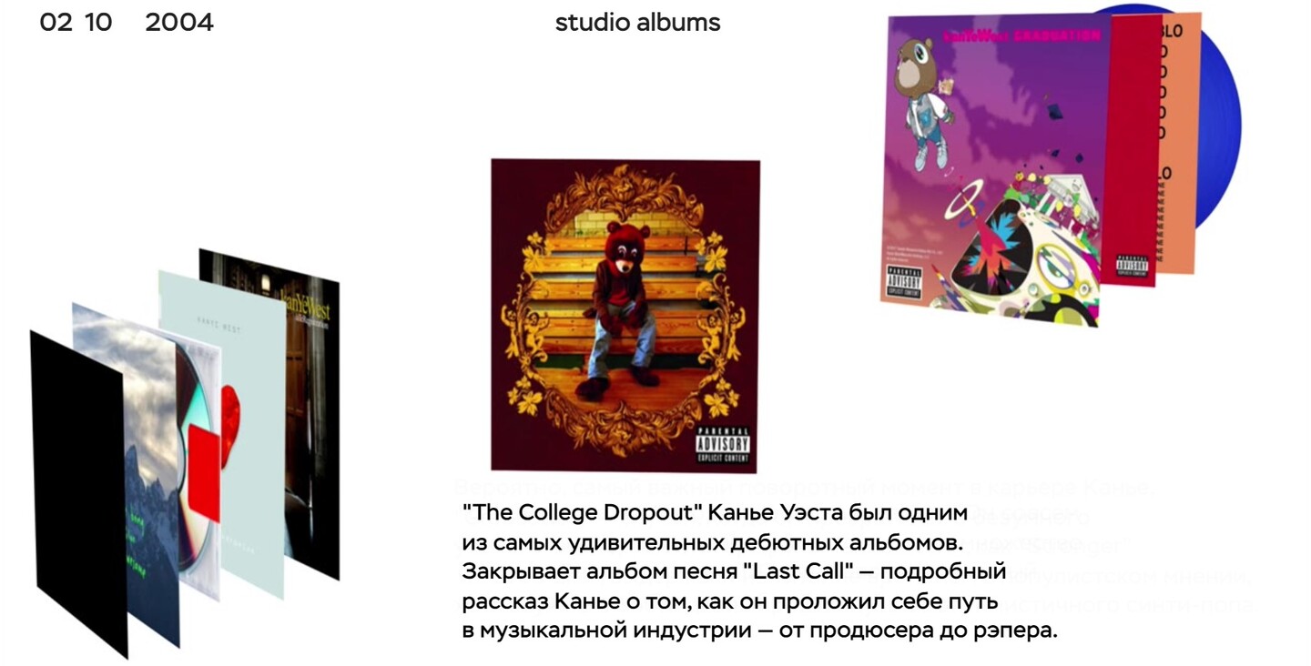 Лонгрид собрал личности Канье в одну матрешку. Из одной вытекает другая. Поэтому я решила использовать прием горизонтального скролла.