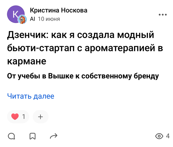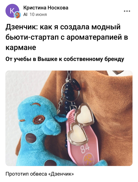 1. Заголовок и лид Текущий вариант: „Дзенчик: как я создала модный бьюти-стартап с ароматерапией в кармане“ „От учебы в Вышке к собственному бренду“