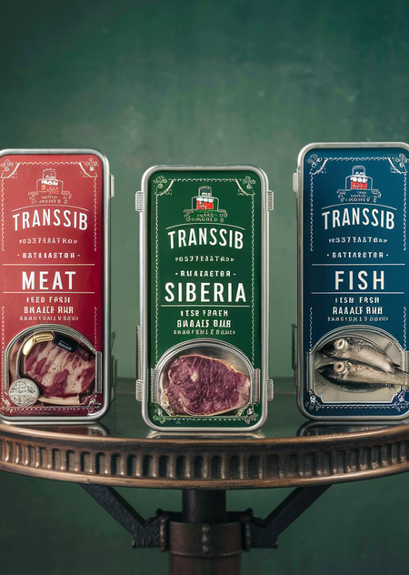 Make 3 packages for the TRANSSIB brand. The brand sells canned products from Siberia: meat and fish. The packaging itself should be elongated and made of metal, its design should refer to railway aesthetics. The logo must be clearly visible on the packaging. Packages must be placed on a characteristic table