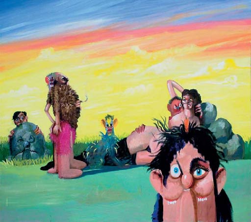 -Присутствуют элементы сюрреализма: персонажи в необычных позах и с неестественными телесными пропорциями.