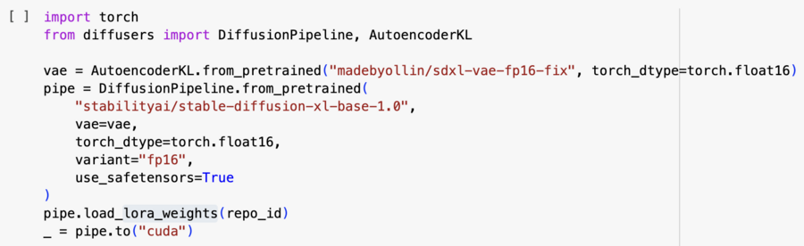 9. Генерируем изображения с помощью обученной модели: - Загружаем исходную модель stable-diffusion-xl и к этой модели присоединяем веса лоры (lora_weights), указываем id нашего репозитория; - Все, мы можем генерировать картинки с использованием стиля Джорджа Кондо.