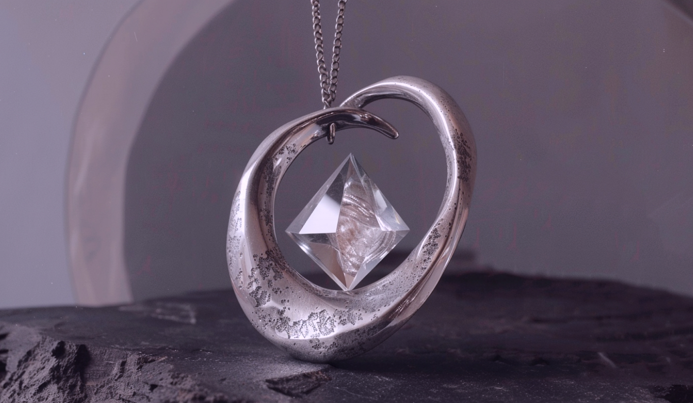 /Image promt: elegant silver necklace with gemstone embedded in the central pendant, delicate flowing lines, luxurious minimalist design, polished metallic texture, glowing pink stone accent, inspired by spirit jewelry concept, professional jewelry photography lighting, soft reflections, balanced composition, cinematic aesthetic --ar 16:9 --v 6