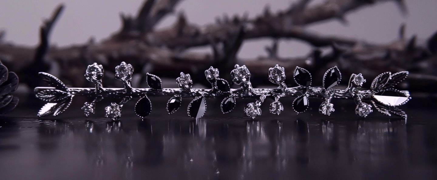 /Image promt: elegant silver hair accessory with embedded gemstones, refined and artistic design, inspired by ancient spirit motifs and modern luxury, intricate metalwork with gemstone inlays, high-detail macro jewelry photo, cinematic lighting on dark background, fine reflections, sophisticated minimalism, symmetrical composition --ar 16:9 --v 6