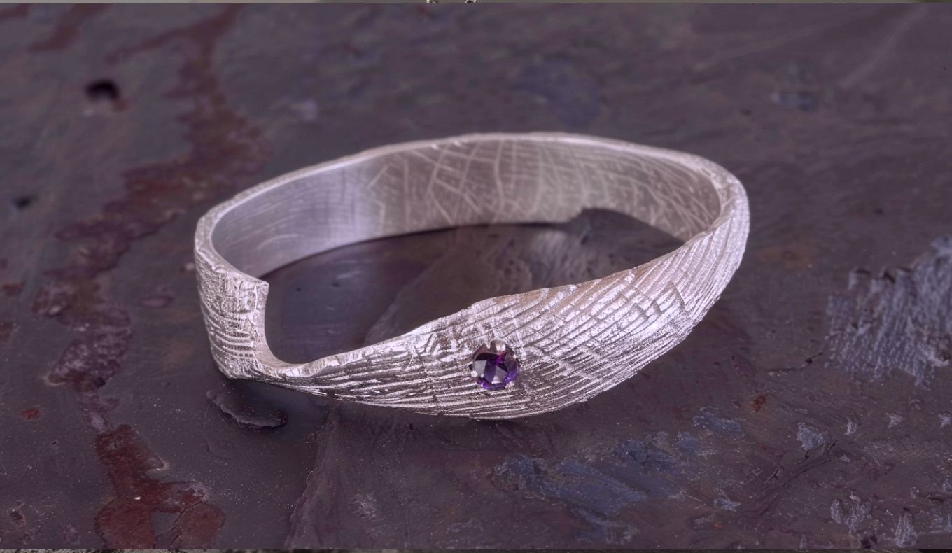 /Image promt: elegant silver bracelet with gemstone embedded inside the inner side of the band, minimal luxury design, smooth metallic texture, refined symmetry, glowing pink gemstone detail, macro jewelry photography, soft cinematic lighting, mythic and modern aesthetic, clean background, high contrast reflections --ar 16:9 --v 6