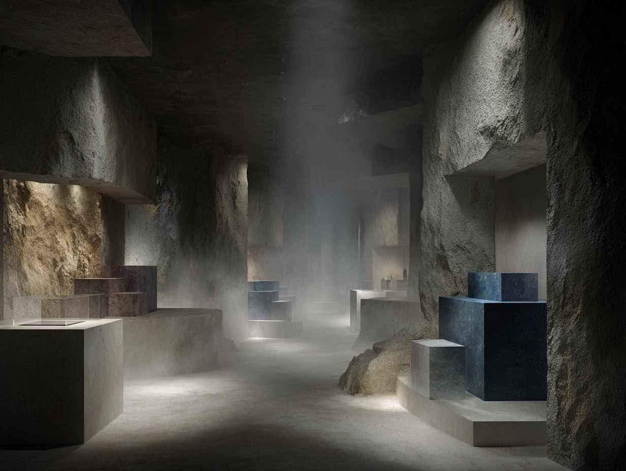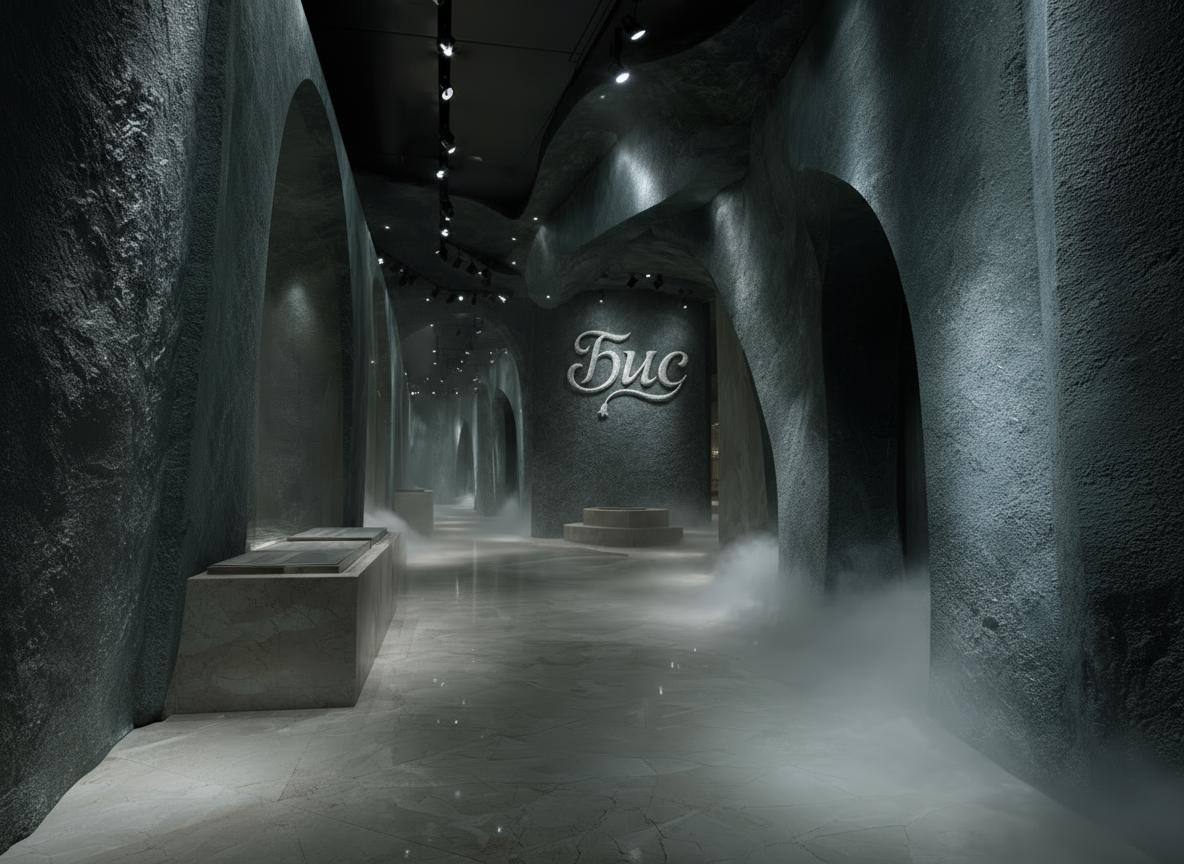 /Image prompt: Luxurious mystical exhibition space inspired by ancient relic aesthetics and mythic spirits, designed for a jewelry brand connecting humans with inner spiritual energy. Organic architectural forms with irregular, flowing shapes, combining metal, stone, and natural textures. Ethereal ambient lighting with soft glows, subtle shadows, and cinematic highlights, creating a sense of magical presence. Mist, floating particles, and faint magical aura evoke the return of spirits and archetypal beings. Neutral yet rich color palette soft matte metals, warm stone, deep sapphire and ruby accents. Spacious, immersive layout with layered depth, elegant pathways and display areas, tactile surfaces, reflective and rough textures, creating a refined yet otherworldly atmosphere. Artistic, high-end, and timeless composition, emphasizing human connection to unseen forces, culture, and myth. No mockups, no products, focus entirely on mystical, luxurious, and immersive spatial experience.
